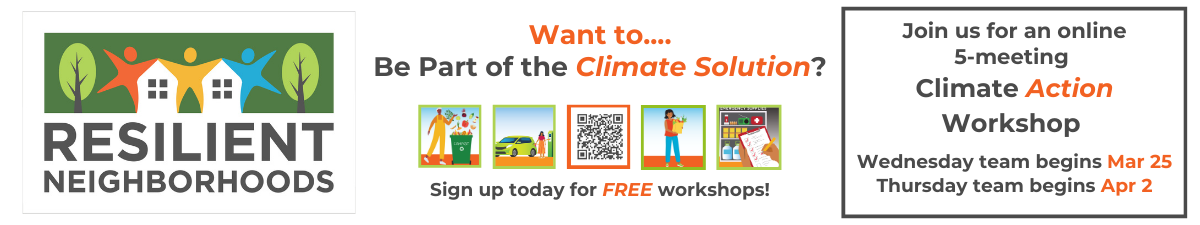 Join Resilient Neighborhoods’ free online interactive Climate Action Workshop and take meaningful steps toward creating a healthier, climate-friendly home and lifestyle.